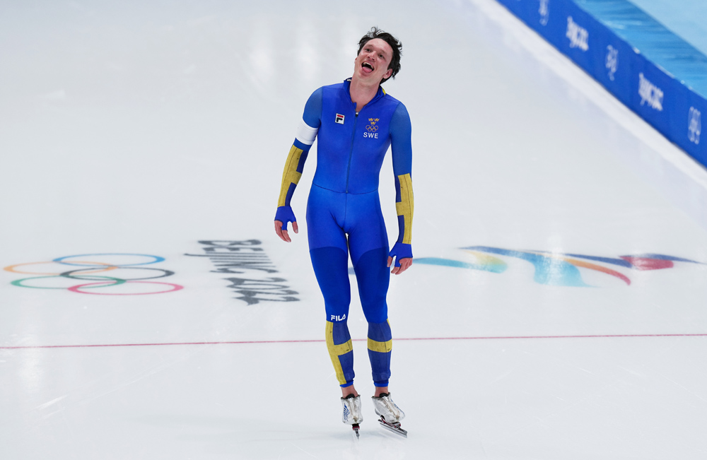 2月6日,北京冬奥会速度滑冰男子5000米比赛在“冰丝带”举行。世界纪录保持者、瑞典选手尼尔斯·范德普尔以6分08秒84破奥运纪录的成绩夺冠。图为尼尔斯·范德普尔在比赛后。(图片来源:中新社)
