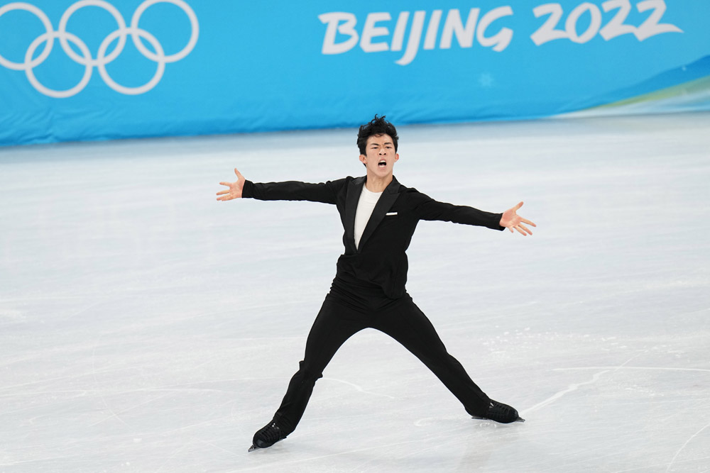 2月8日,北京冬奥会花样滑冰男子单人滑短节目比赛在首都体育馆进行。美国选手陈巍以总得分113.97分,创造了短节目世界纪录。(图片来源:中新社)