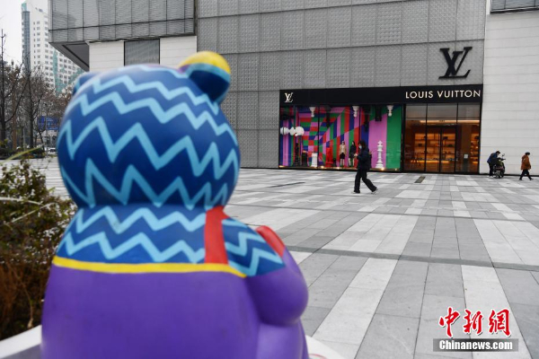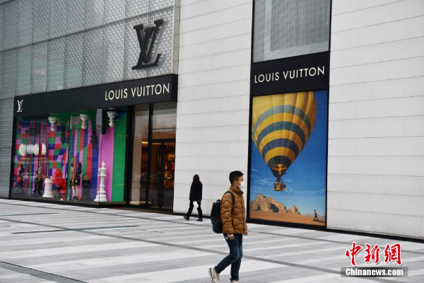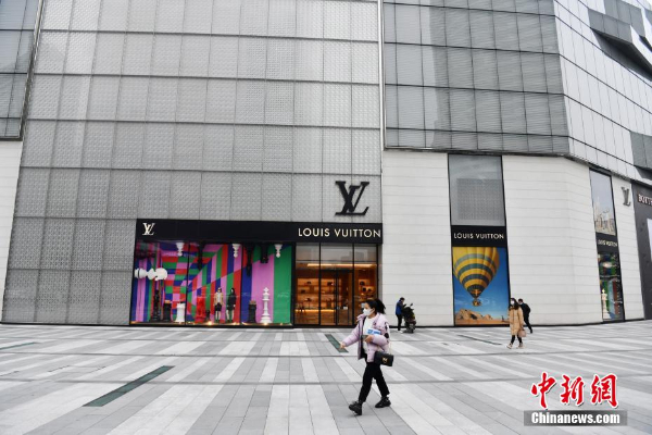 成都市民从路易威登(Louis Vuitton)成都仁恒置地店前经过。