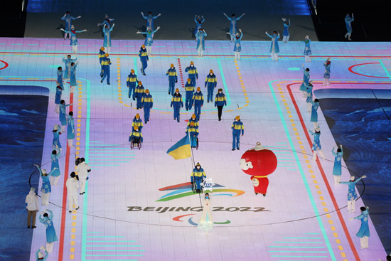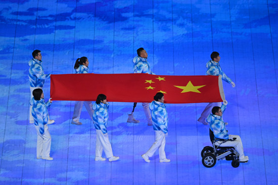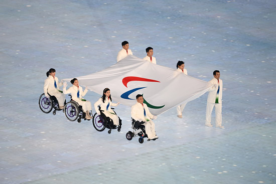 在本届冬残奥会会徽的背景下,各参赛代表团及旗手踏着冰雪赛道而来。冰花中,映出各参赛代表团的中英文名称。为展现对所有参赛代表团及旗手的尊重和礼遇,开幕式采用了巨幅国旗的展示方式。