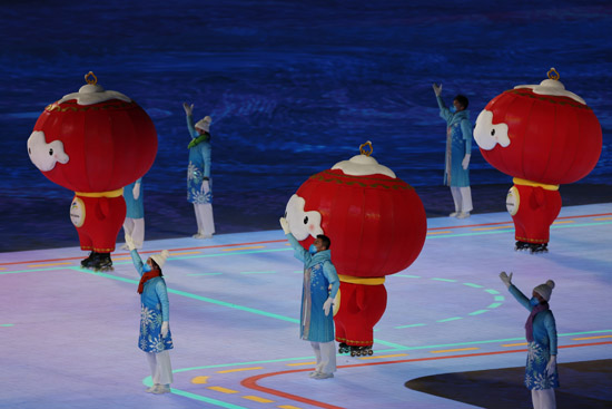 开幕式上,冬残奥会的吉祥物雪容融滑入现场,带出两条冰雪赛道,热情地欢迎着各个参赛代表团的到来。