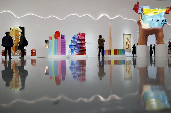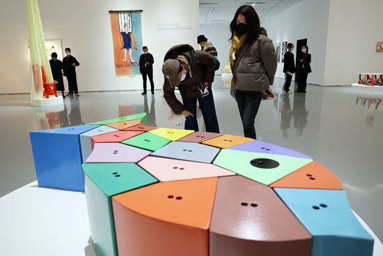 2022年3月19日,参观者在展厅内游览。当日,《加埃塔诺·佩谢:人无完人》北京首展在北京今日美术馆开展。据介绍,加埃塔诺·佩谢是位极富传奇色彩的建筑师、设计师、艺术家。此次展览呈现出佩谢跨越半个多世纪、近100件独特作品,涵盖了品类丰富的家具、产品设计、建筑模型、树脂画、装置和影像复刻、文献资料等媒介,为观众搭建起奇思妙想的缤纷世界。(图片来源:本文图片均由欧洲时报特约记者李大鹏 摄)