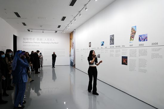 2022年3月19日,加埃塔诺·佩谢工作室代表李玮佳(右)带参观者进行导览。