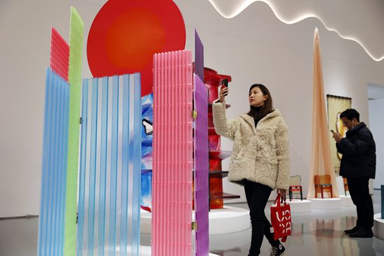 2022年3月19日,参观者拍摄现场展出的装置作品。
