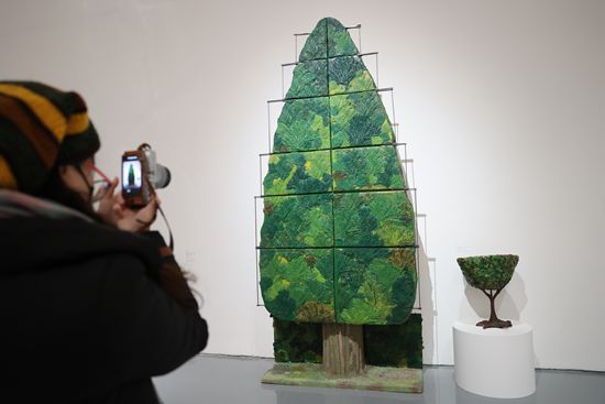 2022年3月19日,现场展出的一件环保作品吸引参观者驻足拍摄。