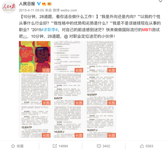 除社交之外,MBTI还被发展成了求职工具。大量迹象表明,MBTI正被广泛应用于企业培训、职业咨询以及个人成长等领域,全球每年约有超过200万人参与测试。智联招聘发布过相关数据报告——《MBTI职场性格类型大数据报告》;滴滴公司产品部也曾组织60名核心或高潜产品经理参加MBTI人格类型测试。