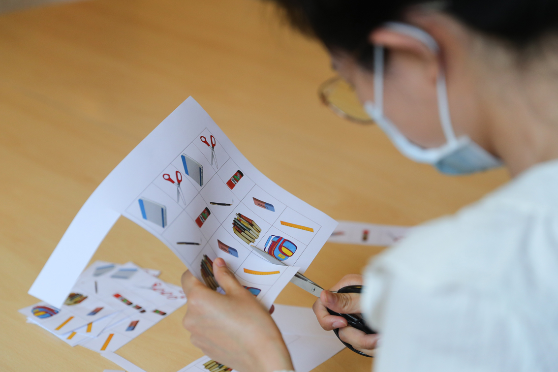 这是4月27日,在比利时布鲁塞尔孔子学院,杨迪在儿童汉语班课前为学生准备课堂互动用的卡片。
