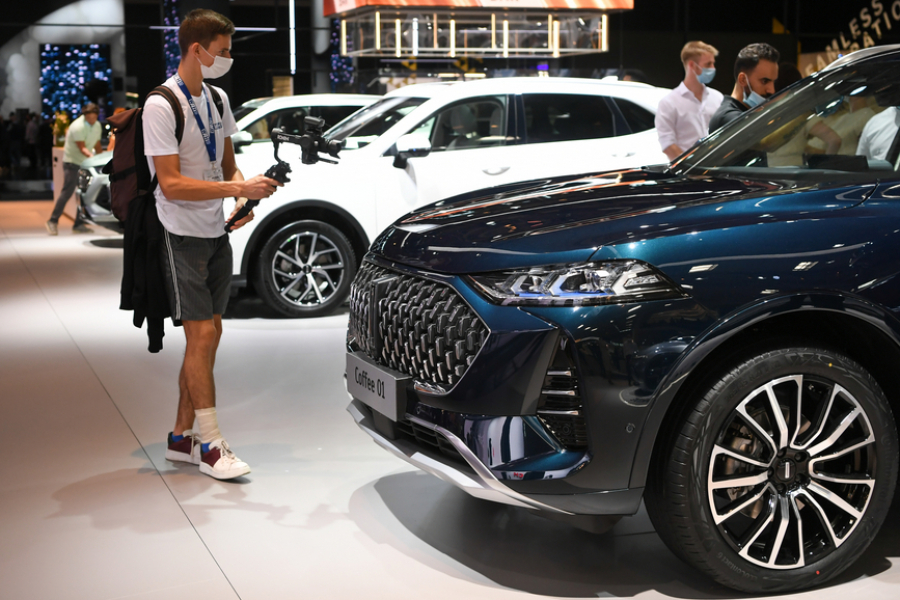在德国慕尼黑举办的德国国际汽车及智慧出行博览会媒体日期间,人们在魏牌汽车展台参观。(图片来源:新华社)