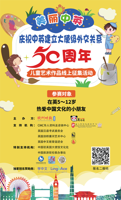 【欧洲时报】2022年是中英建立大使级外交关系50周年。50年同行,中英两国在文化、教育、经济、科技等诸多领域不断交流与融合,实现互利互惠、合作共赢。为了庆祝中英建立大使级外交关系50周年,欧洲时报英国分社将举办“美丽中英”儿童艺术作品线上征集评比活动。本次活动由欧洲时报英国分社、英伦圈主办,CIAC华人资料及咨询中心、英国汉语考试委员会、英国剑桥康河艺术中心,英国中文教育促进会支持,中国驻英国大使馆文化处及中国旅游驻伦敦办事处提供特别支持。