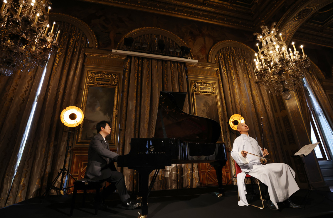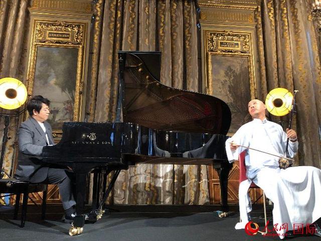 9月1日,郎朗(左)在法国巴黎市政厅举行的新专辑《郎朗的迪士尼》发布会上与二胡演奏家果敢合作演奏。(图片来源:新华社)