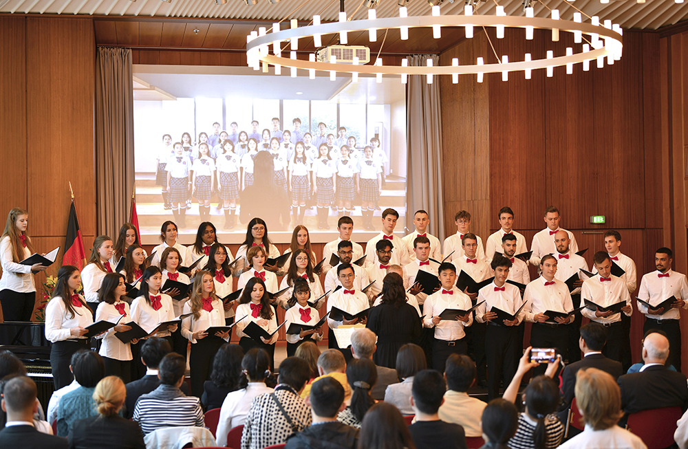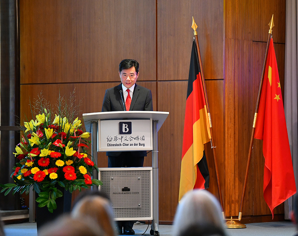 中国驻德国大使吴恳表示,今年是中德建交50周年,伯乐中文合唱团也已经走过第八个年头。如果把中德建交50周年的累累硕果比作璀璨的星河,那伯乐中文合唱团就是星河中一颗耀眼的星。希望同学们继续以歌声为纽带,学好中文,做中德文化的探索者、两国友谊的促进者、跨文化理解的实践者,让这颗星越来越闪耀,照亮更广阔的天地。