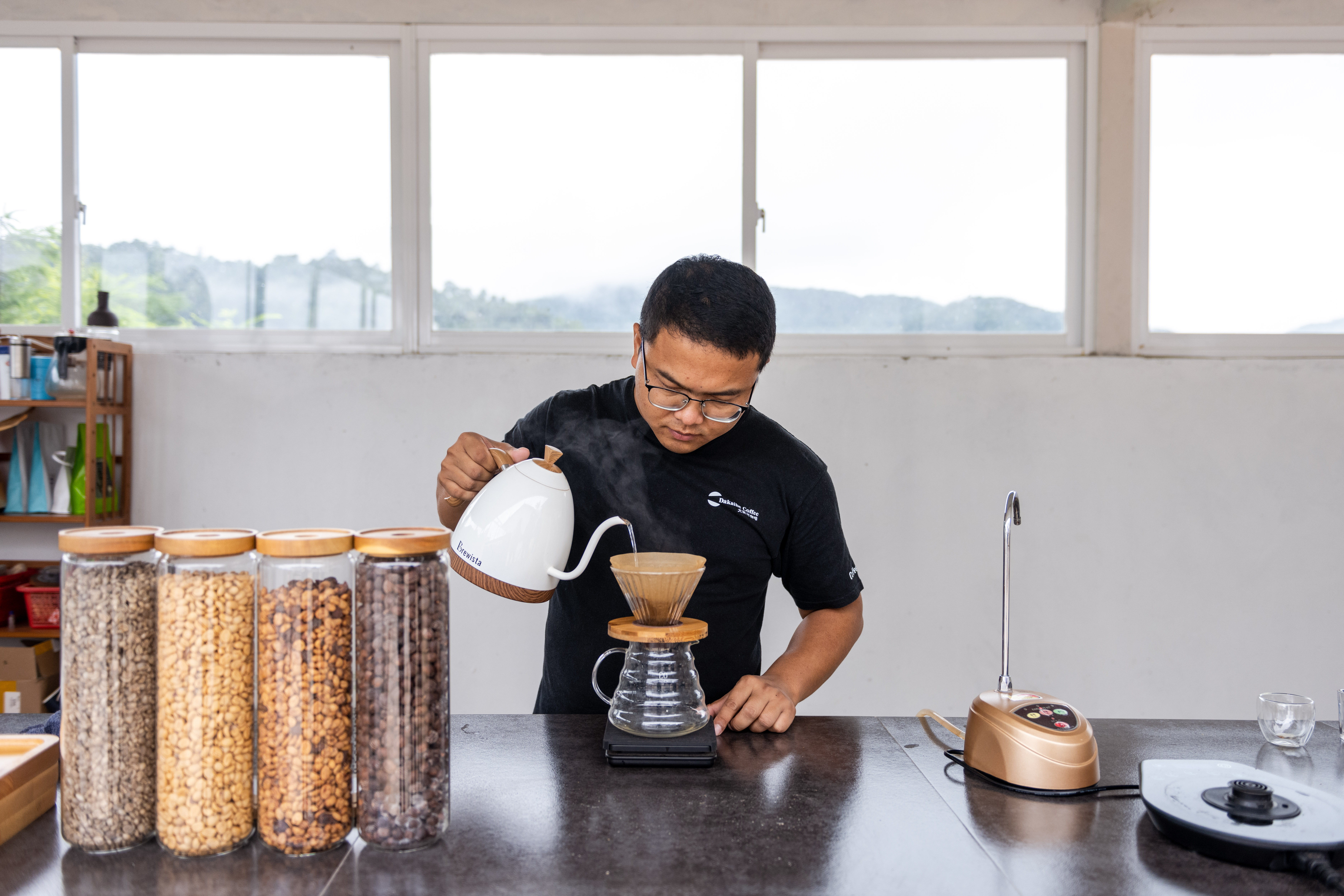 咖啡师在普洱市野鸭塘河谷庄园制作咖啡。(图片来源:新华社)