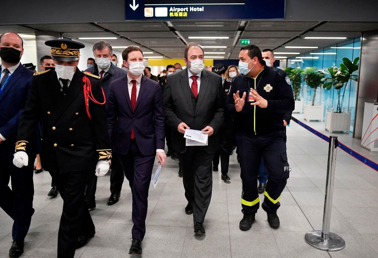 1月1日,法国卫生部长布莱恩(右2)和交通事务部长博内(右3)前往戴高乐机场视察。当天,法国恢复对来自中国的入境旅客的新冠病毒抽检。(图片来源:法新社)