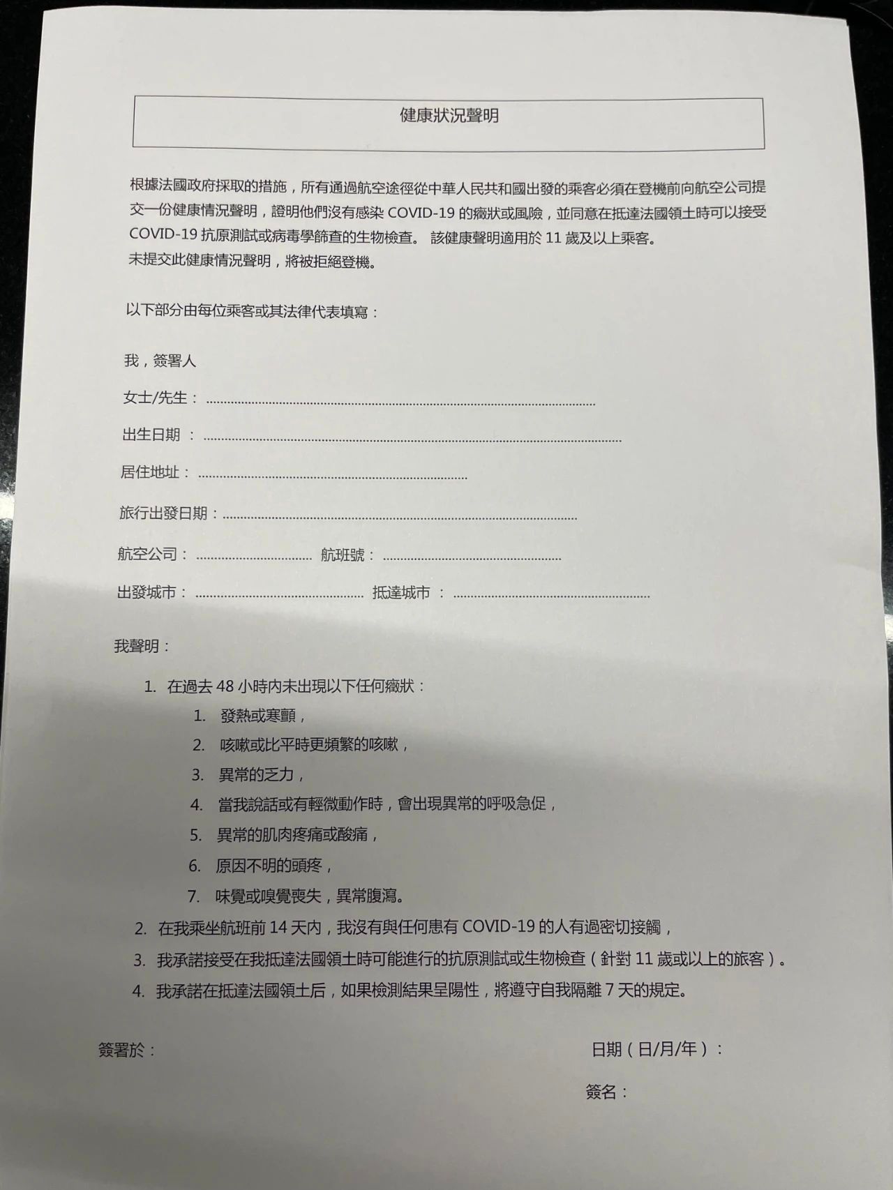 1月1日,欧洲时报记者从中国飞回巴黎,在上海和香港的机场分别收到一份英法双语和一份中文版的《健康状况声明》;工作人员向记者解释,凡飞往法国的旅客都必须填写。本报记者在香港机场等待登机时,被航空公司工作人员告知其被挑中,飞抵巴黎后须接受核酸测试。据记者称,工作人员按照一张名单逐个通知被抽中的乘客。(图片来源:欧洲时报)