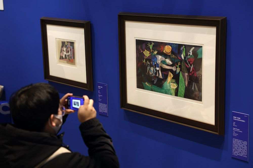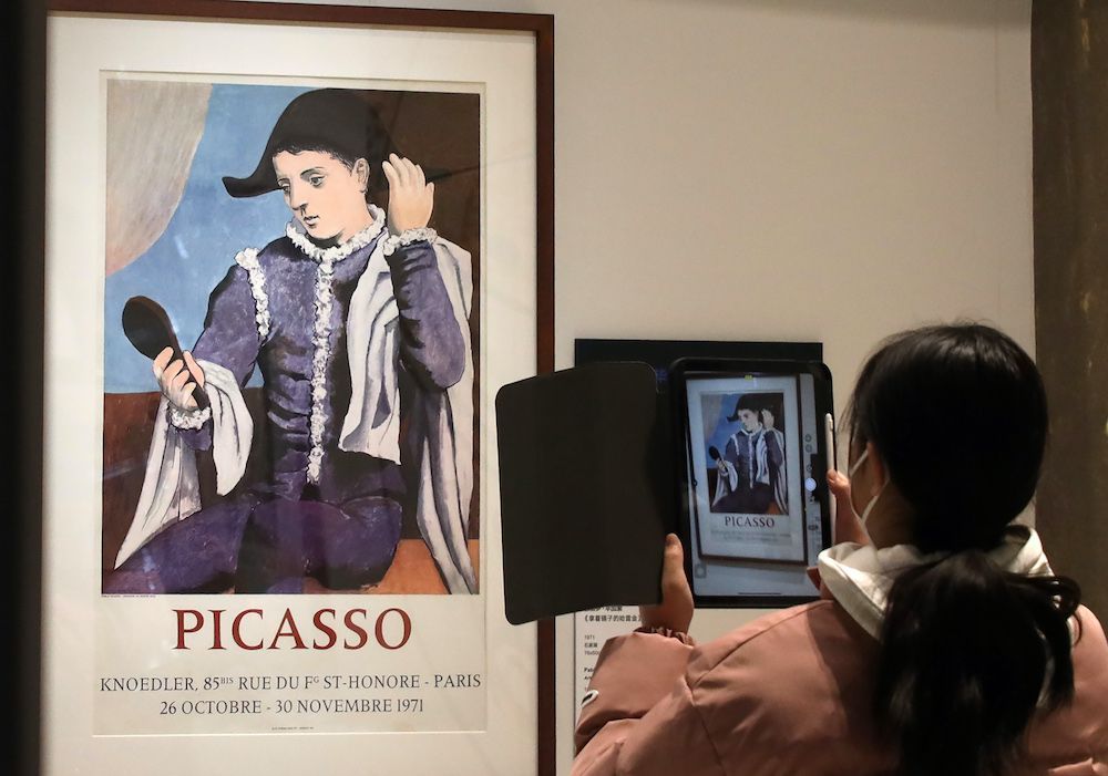2023年1月5日,毕加索于1971年创造的石版画作品《拿着镜子的哈雷金》吸引观众拍摄。