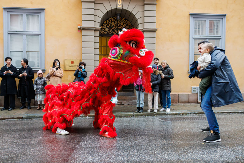 一场融合中瑞文化元素的新春演出14日在瑞典斯德哥尔摩中国文化中心举办,拉开2023年瑞典“欢乐春节”活动的帷幕。图为1月14日,人们在瑞典斯德哥尔摩中国文化中心外观看舞狮。(图片来源:本文图片除标注外均综编自新华社)