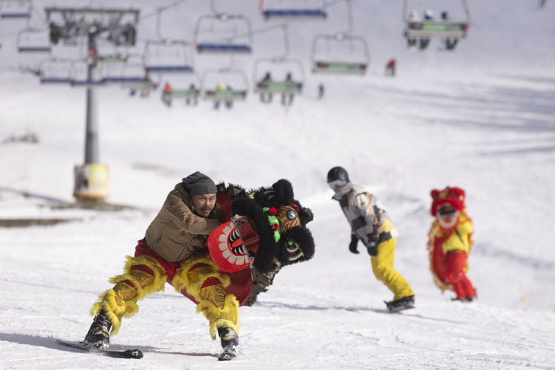 斯洛文尼亚华商会的滑雪爱好者将中国传统文化“舞狮”与斯洛文尼亚体育强项滑雪相结合,上演了一场“雪山舞狮”,迎接农历新春佳节。图为1月14日,一名滑雪爱好者(左)在斯洛文尼亚克尔瓦韦茨滑雪场表演舞狮。
