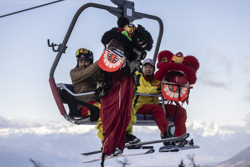 1月14日,在斯洛文尼亚克尔瓦韦茨滑雪场,两名表演舞狮的滑雪爱好者乘坐缆车。