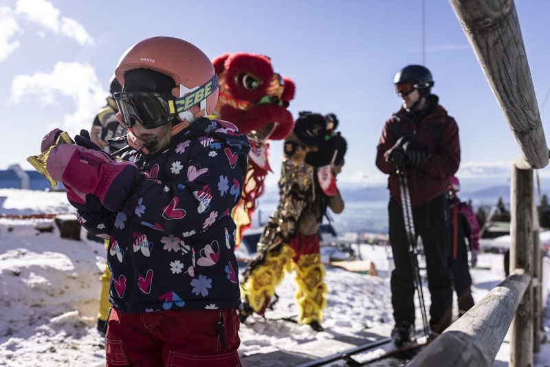 1月14日,在斯洛文尼亚克尔瓦韦茨滑雪场,一名小朋友查看舞狮表演者赠送的“福袋”。