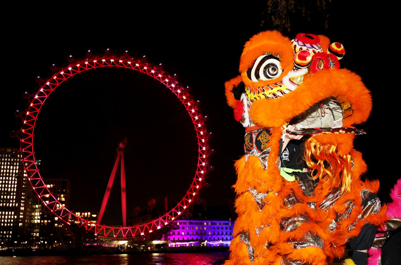 1月13日,在英国伦敦,演员在亮起红色灯光的“伦敦眼”前表演舞狮。
