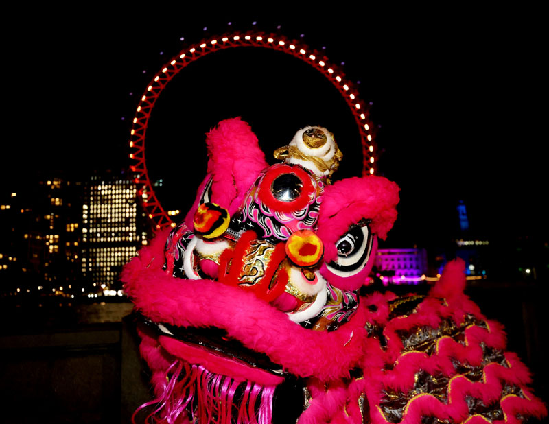 1月13日,在英国伦敦,演员在亮起红色灯光的“伦敦眼”前表演舞狮。当晚,英国伦敦地标建筑、巨型摩天轮“伦敦眼”亮起红色灯光,迎接中国农历新年的到来。