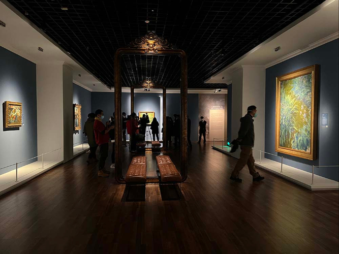 中新社报道,在展览现场,“梵高和印象派绘画”板块备受关注,展出了马奈的《咖啡厅演奏会的一角》、塞尚的《画室中的火炉》、莫奈的《鸢尾花》等多件作品。印象派画家通常在户外作画,直接面对主题进行创作,记录下对周围环境产生的即时而自然的感受。如莫奈在晚期时隐居至法国北部,培育了拥有200多种鸢尾花的水上花园,这些鸢尾花成为画家晚期一些富有表现力的大尺幅画作的灵感来源。