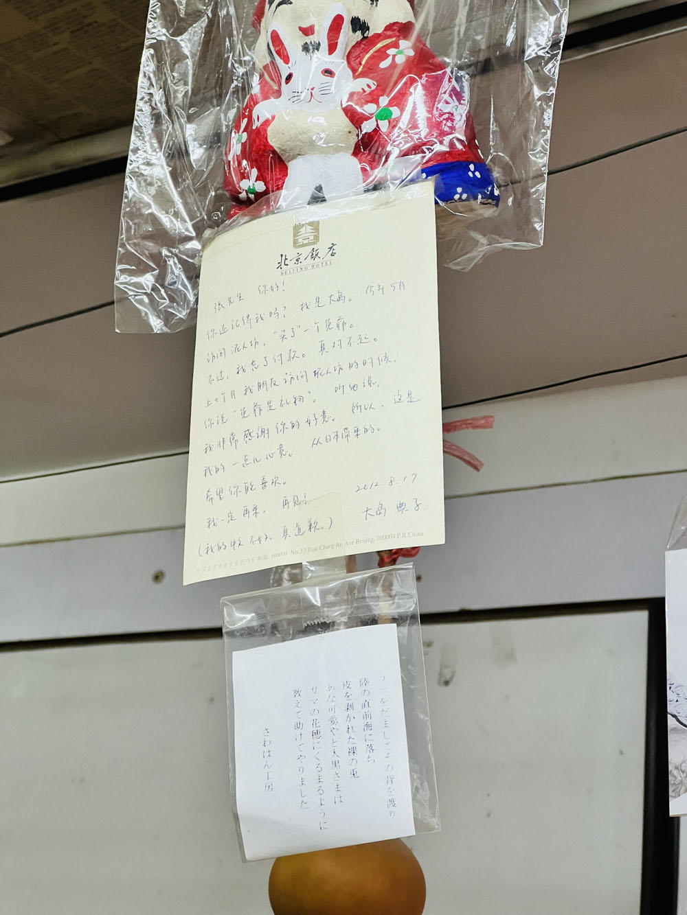 北京兔儿爷店里,一位日本顾客托朋友带来的礼物和信件。