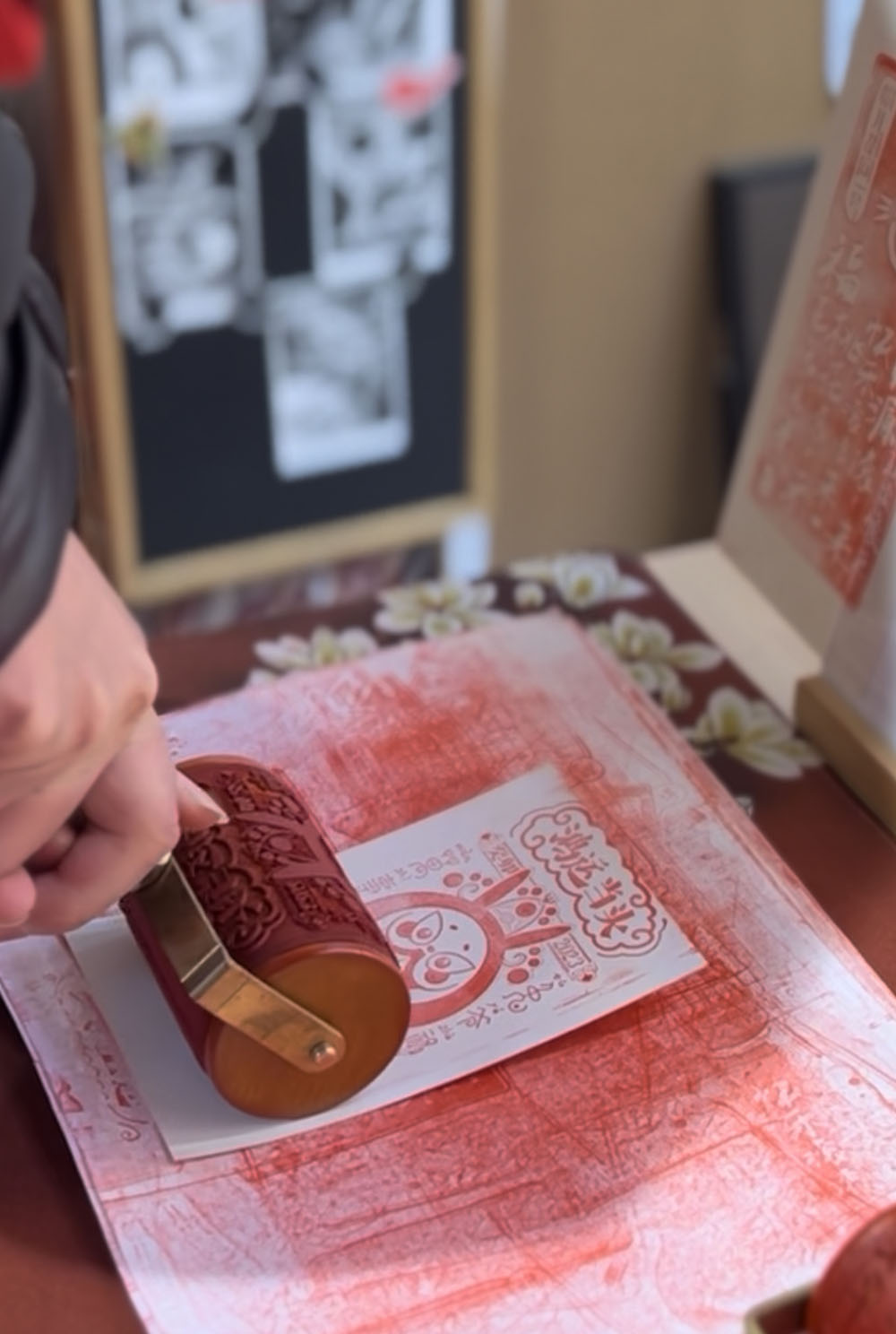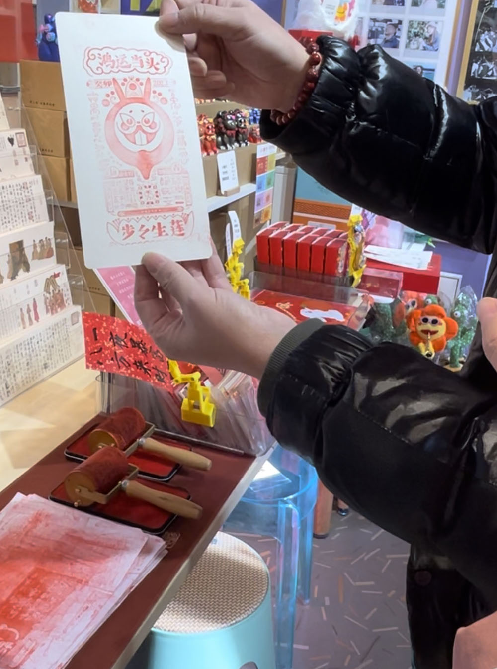 南锣鼓巷文创店店主用自创滚轮在顾客购买的明信片背后印刷出的“文昌猫”兔爷。