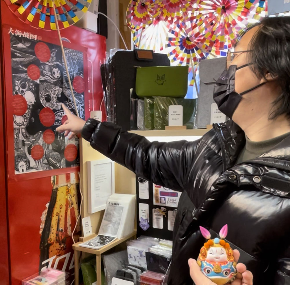 近年来,“新国潮”,以“老传统”为基底,打开了它们与不同年龄,乃至不同种族之间的另一种对话方式。“我们把文昌猫变成了兔爷的形象,”在南锣鼓巷一家创意小店“别闹”里,店主刘先生拿起一张明信片讲述道,背面就印着他说的文昌猫兔爷图案,“我们有自创的滚轮印章,是老印刷的方式,很多人买完卡片等东西都会来这里盖章。”