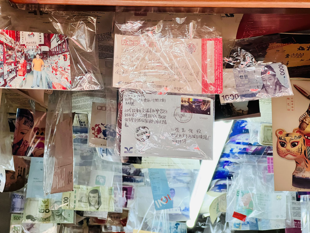 在琉璃厂北京兔儿爷店里,悬挂着各地顾客送来的多国货币和明信片。