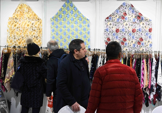 2月6日,第26届中国纺织品服装贸易展览会(巴黎)暨巴黎国际服装服饰采购展在巴黎北郊布尔歇展览中心启幕。参展的数百家中国展商努力通过展会寻找商机。图为外国客商在中国展商展台前驻足围观。(图片来源:中新社)