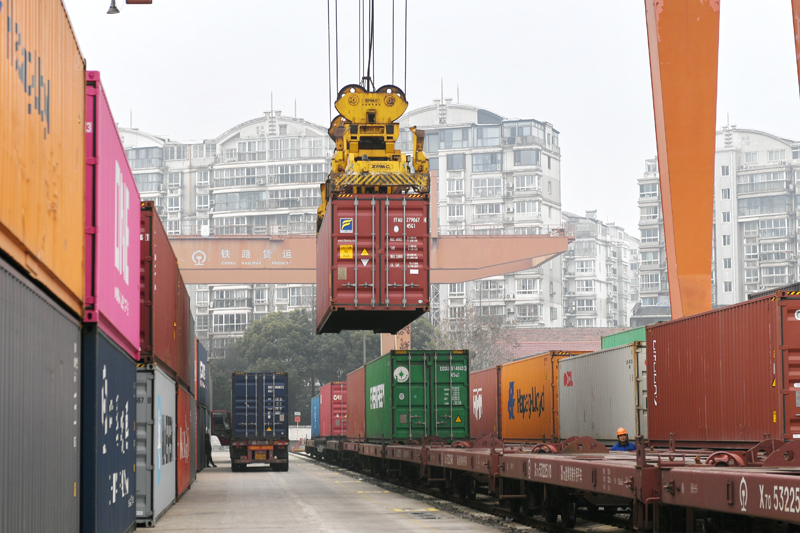 2月8日,在常州站铁路货场,装载新能源汽车的集装箱被装上海铁联运班列。(图片来源:新华社)