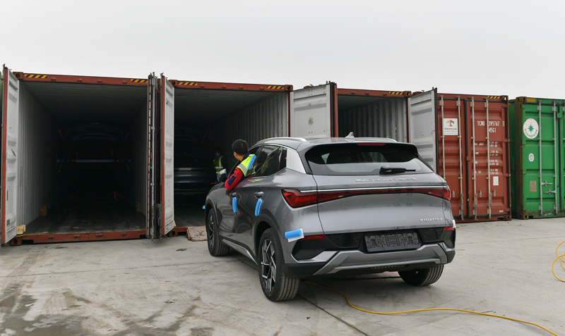 2月8日,国产新能源汽车驶入集装箱装运。(图片来源:新华社)