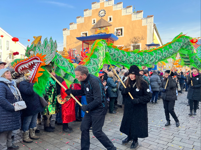 当天共有40余个方阵参与狂欢节队伍游行,迪特福特的小学生和来自幼儿园的孩子们也参与其中;由慕尼黑华星艺术团组织的侨界代表亦身着中国文化特色服装首次参与游行。当日,中国驻慕尼黑总领事馆一行还为迪特福特带去“中国红”围巾和吉祥兔作礼物,双方代表用中文问候“过年好”。