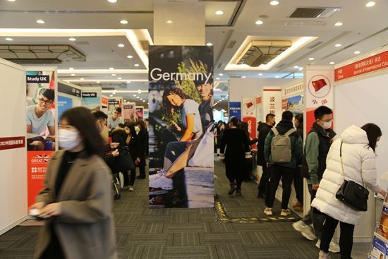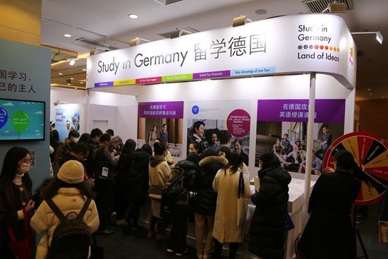 2月17日,在第23届中国国际教育展德国展台前,参展观众排队咨询,留学业务火爆。