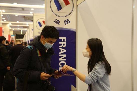 2月17日,参观者在第23届中国国际教育展法国展区咨询。