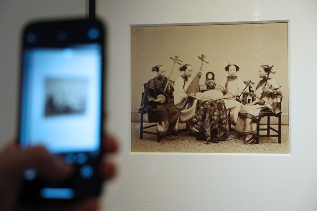 2023年3月8日,埃米尔·瑞斯菲尔德1870年的照片《广东音乐女艺人》吸引参观者拍摄。