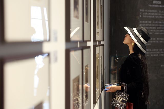 2023年3月8日,一位打扮时髦的参观者被百年前的照片吸引驻足。