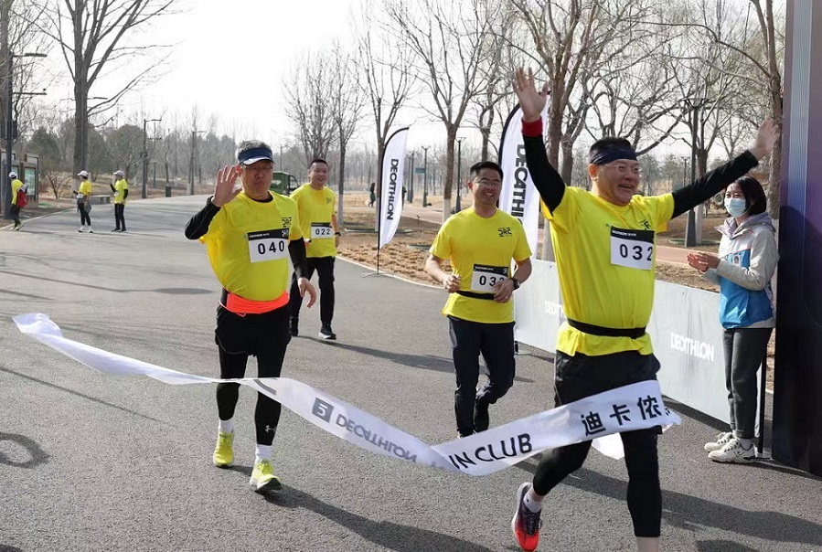 3月14日上午,“运动向巴黎”北京站活动在北京城市绿心森林公园举行。本站活动以跑步运动为主题,旨在激发全民运动热情,倡导健康可持续的乐活生活方式。图为选手冲过终点。(图片来源:新华网)