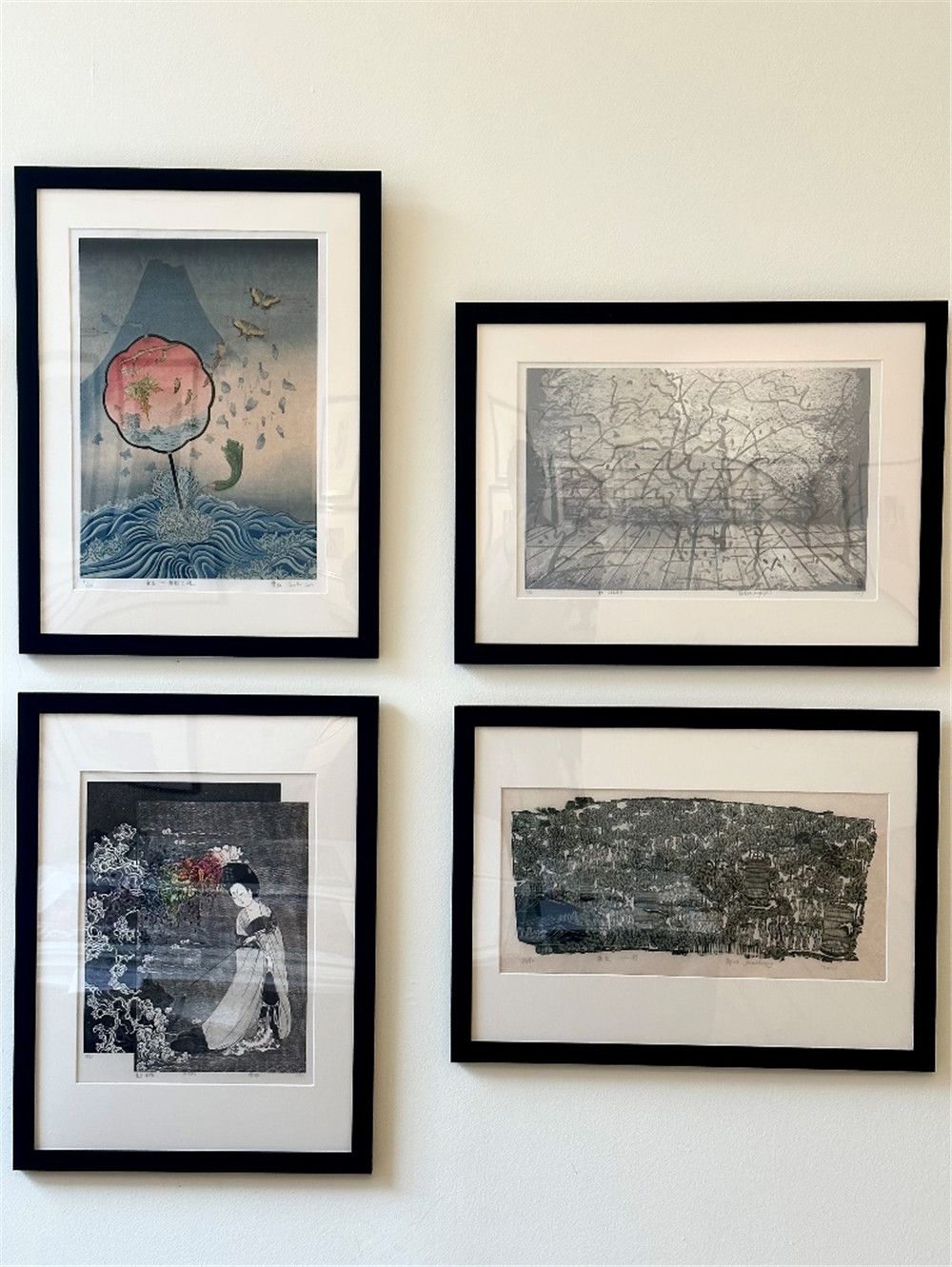 (ArtChina画廊展出的部分中国艺术家版画作品。欧洲时报万萌珂 摄)