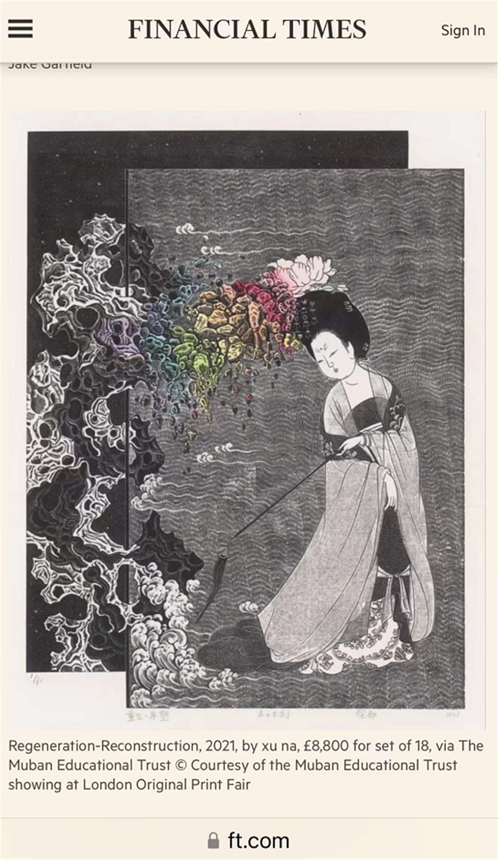 (《金融时报》有关伦敦原创版画博览会的报道中,选用了木版教育信托收藏的中国版画家徐那的作品。)