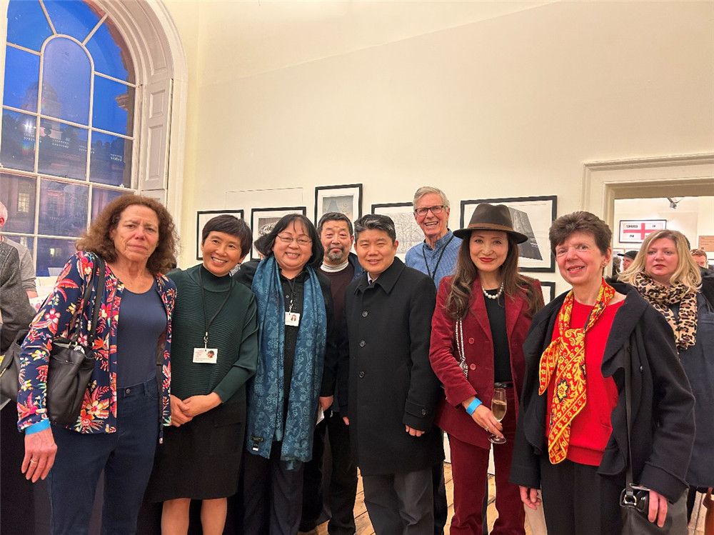 (中国驻英大使馆文化公参李立言(前排左四)、大英博物馆东方部研究员金曼仪(左一)、木版教育信托秘书长郑海瑶(左二)、信托高级研究员龙安妮(右一)、英国北京联合会会长李海(左三)等中外嘉宾,在伦敦原创版画博览会的开幕式上合影。)