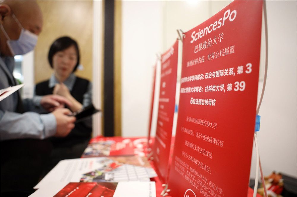 2023年4月2日,巴黎政治大学展台上展出优势学科、“6位法国总统母校”等信息,吸引中国学生和家长。