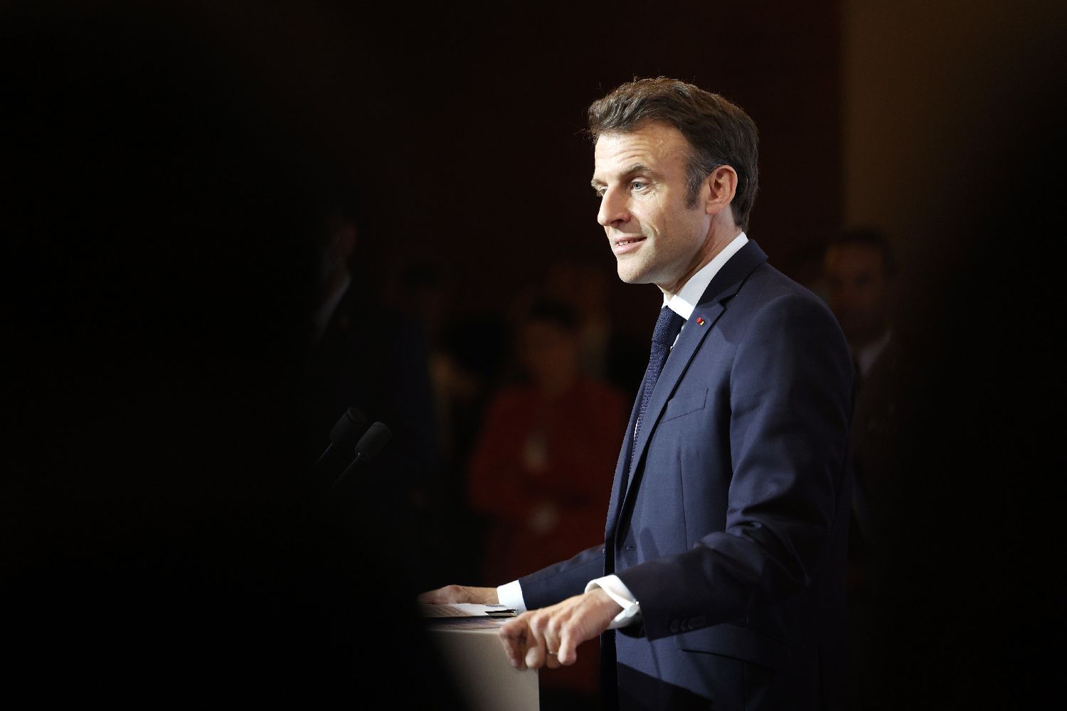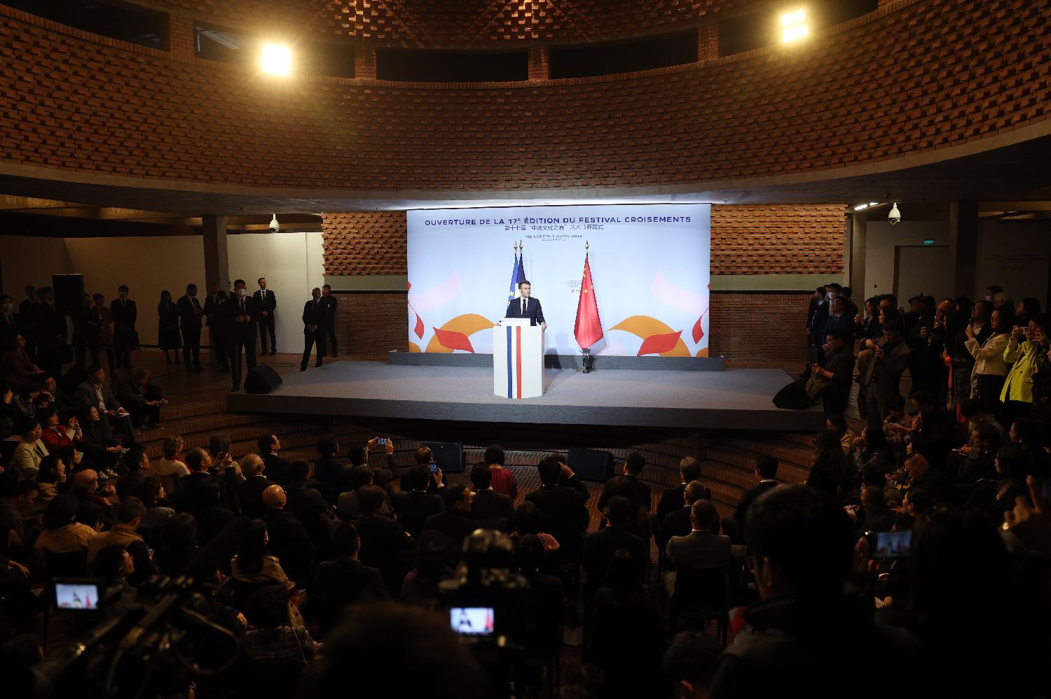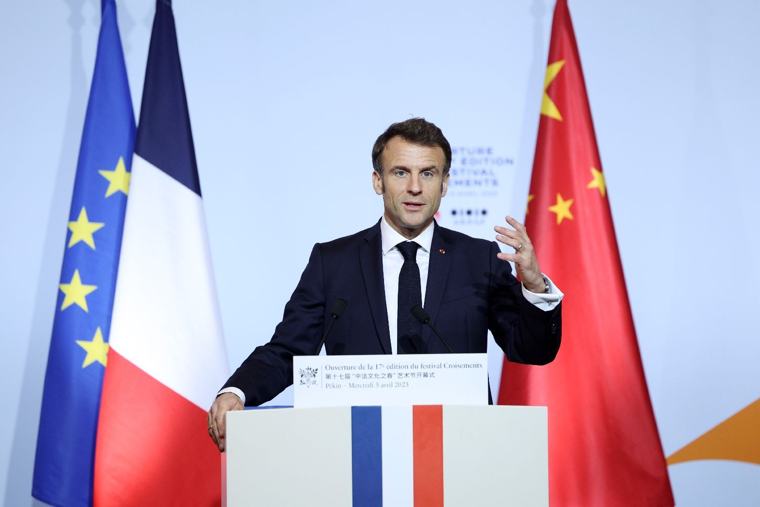 4月5日,马克龙总统在北京红砖美术馆发表演讲。