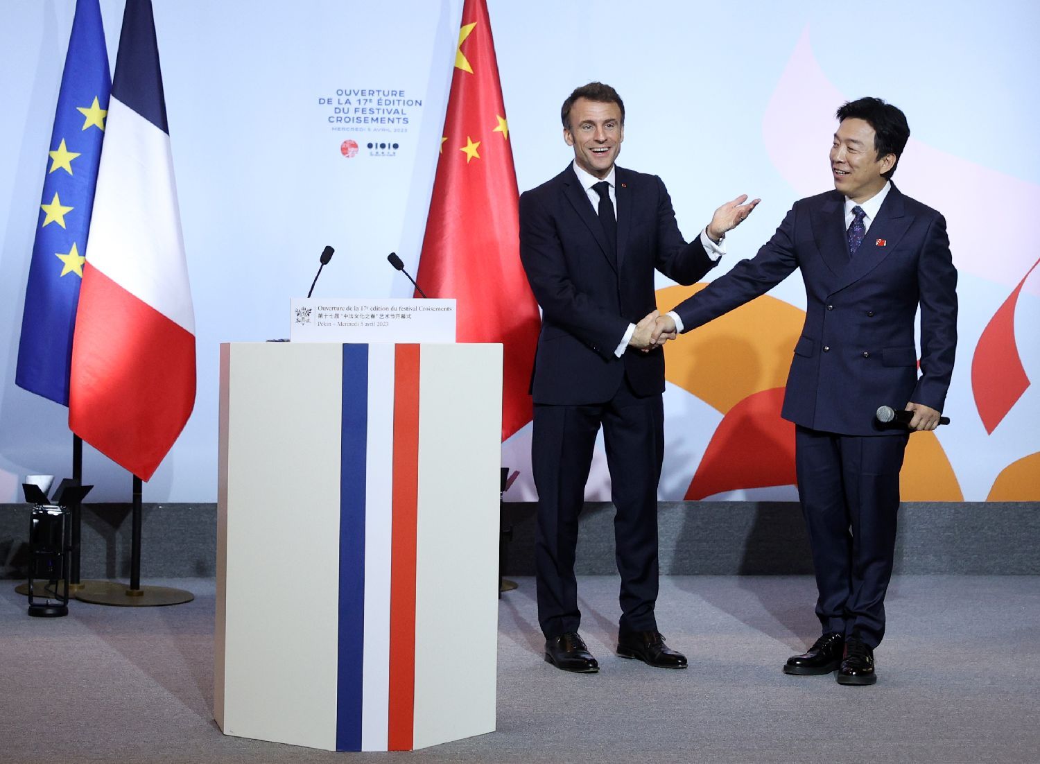 4月5日,马克龙(左)向与会者介绍本届中法文化之春宣传大使——中国知名演员黄渤。