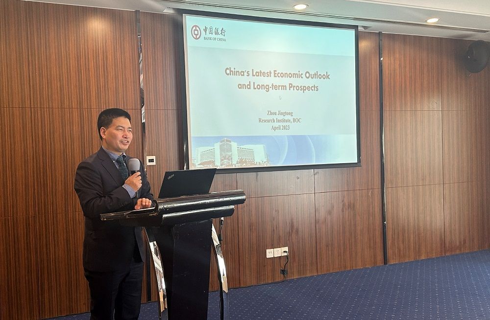 LEMIERE)、米其林集团董事长孟立国(Florent MENEGAUX)、彼欧集团董事长比雷勒(Laurent BURELLE)、法国液化空气集团董事长博天(Benoit POTIER)等。中国银行巴黎分行行长何立勤女士致欢迎辞,中国银行研究院副院长周景彤博士就中国宏观经济最新发展作了主旨演讲。 何立勤行长在致辞时提出,中国银行一直是中法两国之间经贸合作的积极推动者、坚实践行者、奋发引领者,未来将继续积极发挥桥梁纽带作用融通中法交流,促进经济金融市场双向开放合作,重点推动绿色金融、科技创新和低碳发展,以中行金融“智慧”推动中法经济金融合作不断取得新突破。 中国银行研究院副院长周景彤博士向在座的法国世界五百强、行业龙头企业董事长、首席执行官讲解了中国宏观经济最新情况,包括外部宏观环境、短期经济表现、宏观经济政策和长期发展趋势等。展望2023年,中国经济将步入内外需增长动能转换期,宏观政策将聚焦稳增长、稳就业、稳物价,推动消费需求持续恢复,积极营造有利于外贸发展的环境。从中长期来看,稳定向好是中国经济发展的深层底色,到2035年,中国有望实现成为中等发达国家的战略目标。未来,中国经济的高质量发展、超大规模消费市场、高水平对外开放加速以及中国式现代化建设等历史性机会将为欧洲、法国企业在华发展提供更多难得发展机遇 在讲座互动环节,有客人提问希望进一步了解2023年中国经济发展面临的最大挑战,以及法资、欧资公司在华业务的最大机遇。周景彤博士回应,短期内中国经济发展面临的最大挑战或来自外部,主要由于全球经济增速放缓、国际金融市场波动变大等;中国将加快转变经济发展方式,更加注重技术创新、绿色低碳、区域经济等,更加聚焦高质量发展,建议法资、欧资企业加强关注上述领域,积极把握合作机会。 本次专题讲座是法国总统马克龙访华系列活动之一,旨在加深法资企业对中国最新经济形势了解,增强法国企业对中国经济发展信心,促进中欧、中法经贸关系稳定健康发展。![]()