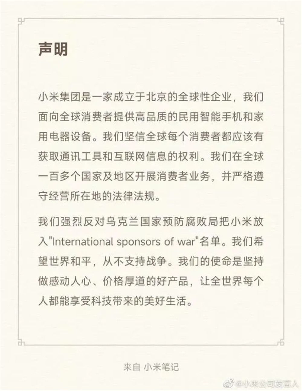 我们强烈反对乌克兰国家预防腐败局把小米入"International sponsors of war"名单。我们希望世界和平,从不支持战争。我们的使命是坚持做感动人心、价格厚道的好产品,让全世界每个人都能享受科技带来的美好生活。