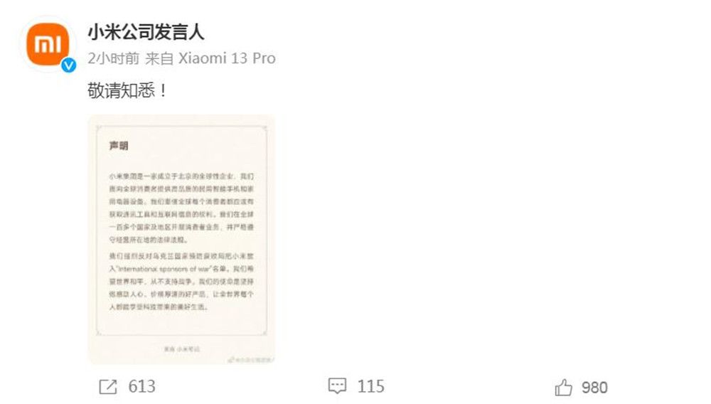 被乌克兰列为俄方“国际赞助商”名单,小米回应:强烈反对,从不支持战争