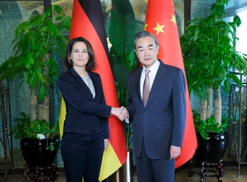 4月15日,王毅在北京会见德国外长贝尔伯克。(图片来源:新华社)