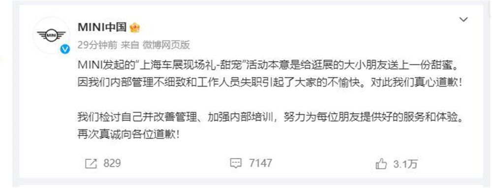 20日下午,@MINI中国发布微博致歉称,“MINI发起的‘上海车展现场礼-甜宠’活动本意是给逛展的大小朋友送上一份甜蜜。因我们内部管理不细致和工作人员失职引起了大家的不愉快。对此我们真心道歉!我们检讨自己并改善管理、加强内部培训,努力为每位朋友提供好的服务和体验。再次真诚向各位道歉!”